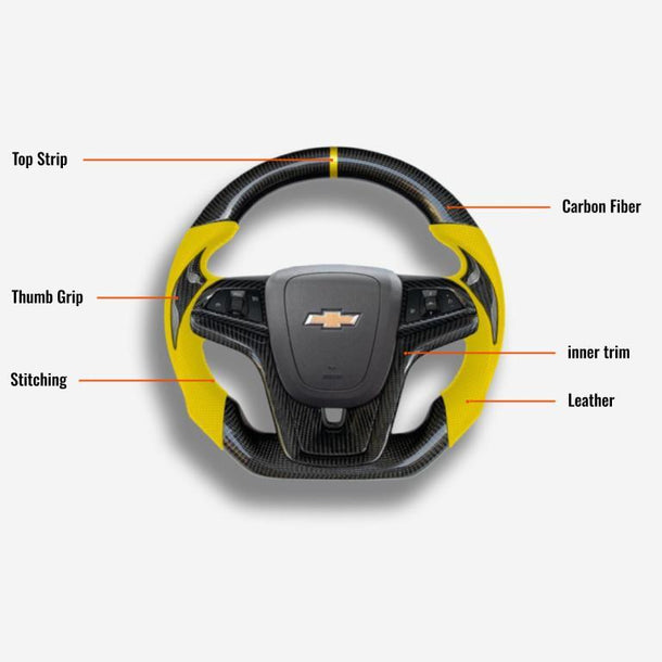 The Camaro steering wheel is meticulously handcrafted from premium Japanese carbon fiber and beautifully wrapped in Italian leather, enhancing the aesthetics of your car and providing better control. The ergonomic, sporty design ensures a more responsive and engaging driving experience. Designed specifically for the Chevy Camaro (2012-2015) models, it fits seamlessly and provides a superior grip. The carbon fiber is coated with a UV-resistant layer to protect against the elements. For an even more thrilling drive, consider adding an LED strip. Perfect for Camaro enthusiasts looking to build a high-end custom interior.