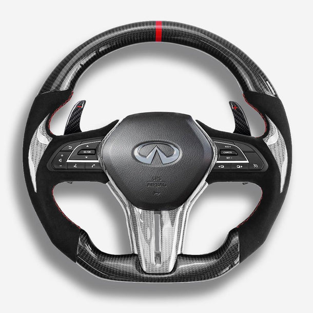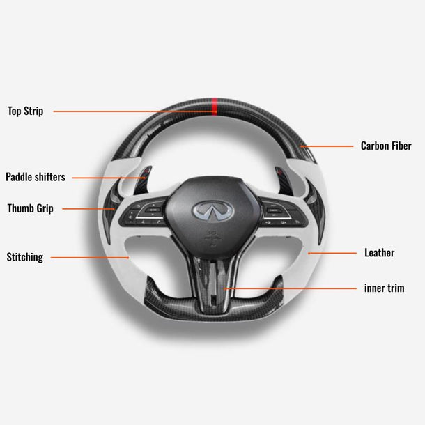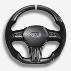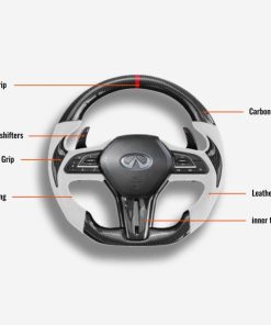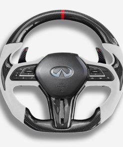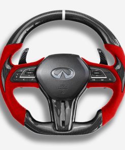 The Infiniti Q50 / Q60 steering wheel is meticulously handcrafted from premium Japanese carbon fiber and beautifully wrapped in Italian leather, enhancing the aesthetics of your car and providing better control. The ergonomic, sporty design ensures a more responsive and engaging driving experience. Designed specifically for the Q50 and Q60 (2018+ models), it fits seamlessly and provides a superior grip. The carbon fiber is coated with a UV-resistant layer to protect against the elements. For an even more thrilling drive, consider adding an LED strip. Perfect for Q50 and Q60 enthusiasts looking a steering wheel upgrade for a high-end custom interior.
