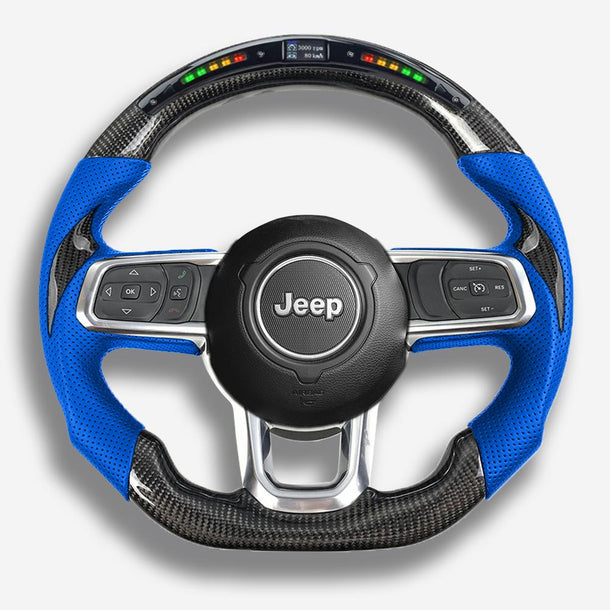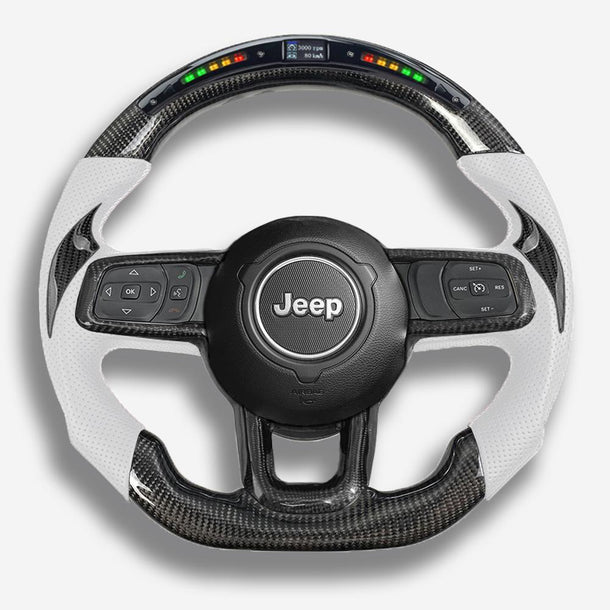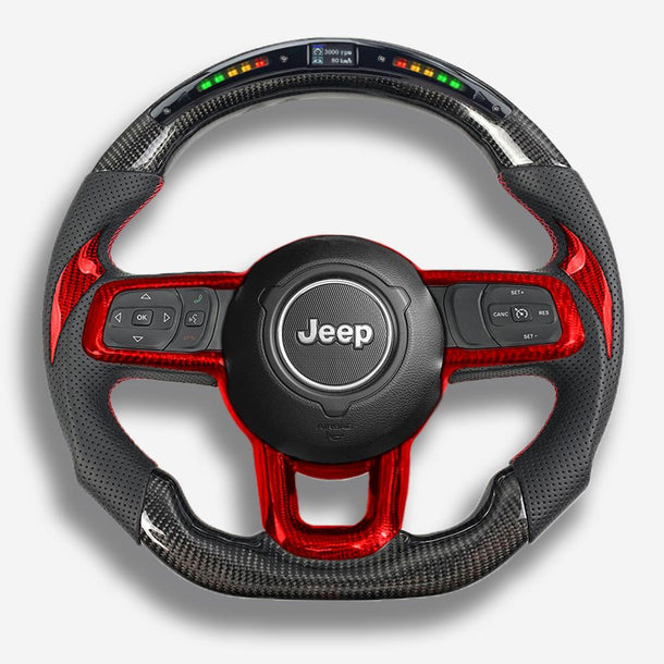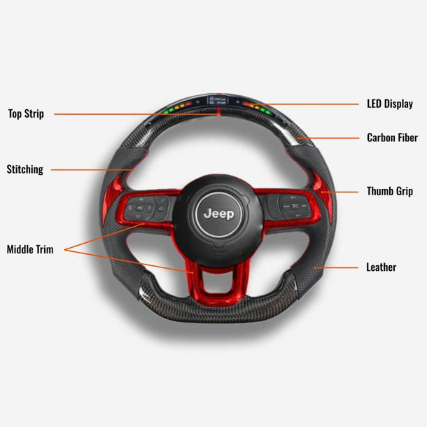 The Jeep Wrangler / Gladiator steering wheel is meticulously handcrafted from premium Japanese carbon fiber and beautifully wrapped in Italian leather, enhancing the aesthetics of your car and providing better control. The ergonomic, sporty design ensures a more responsive and engaging driving experience. Designed specifically for the Wrangler and Gladiator models, it fits seamlessly and provides a superior grip. The carbon fiber is coated with a UV-resistant layer to protect against the elements. For an even more thrilling drive, consider adding an LED strip. Perfect for Wrangler and Gladiator enthusiasts looking to build a high-end custom interior.