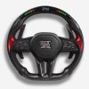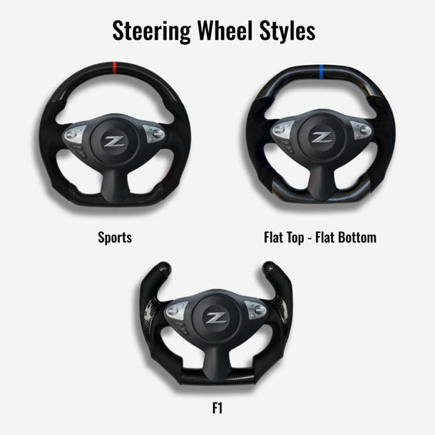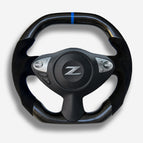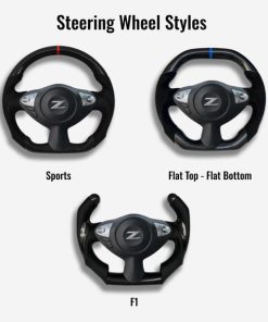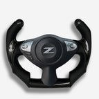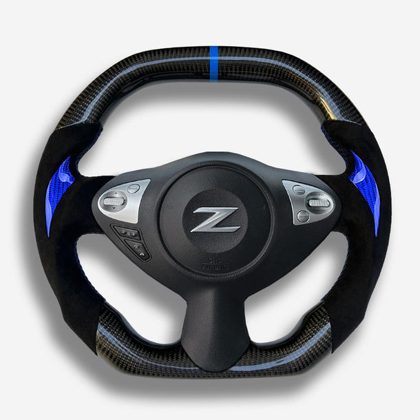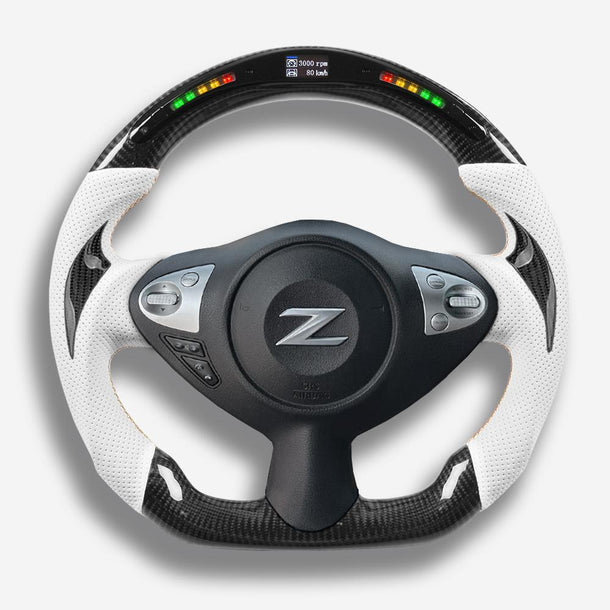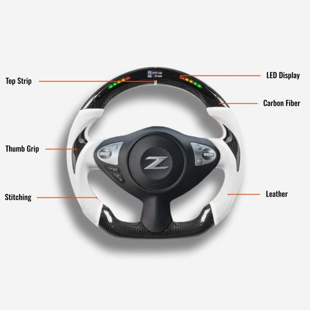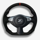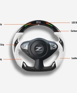 The Nissan 370z steering wheel is meticulously handcrafted from premium Japanese carbon fiber and beautifully wrapped in Italian leather, enhancing the aesthetics of your car and providing better control. The ergonomic, sporty design ensures a more responsive and engaging driving experience. Designed specifically for the 370z, it fits seamlessly and provides a superior grip. The carbon fiber is coated with a UV-resistant layer to protect against the elements. For an even more thrilling drive, consider adding an LED strip. Perfect for 370z enthusiasts looking a steering wheel upgrade for a high-end custom interior.